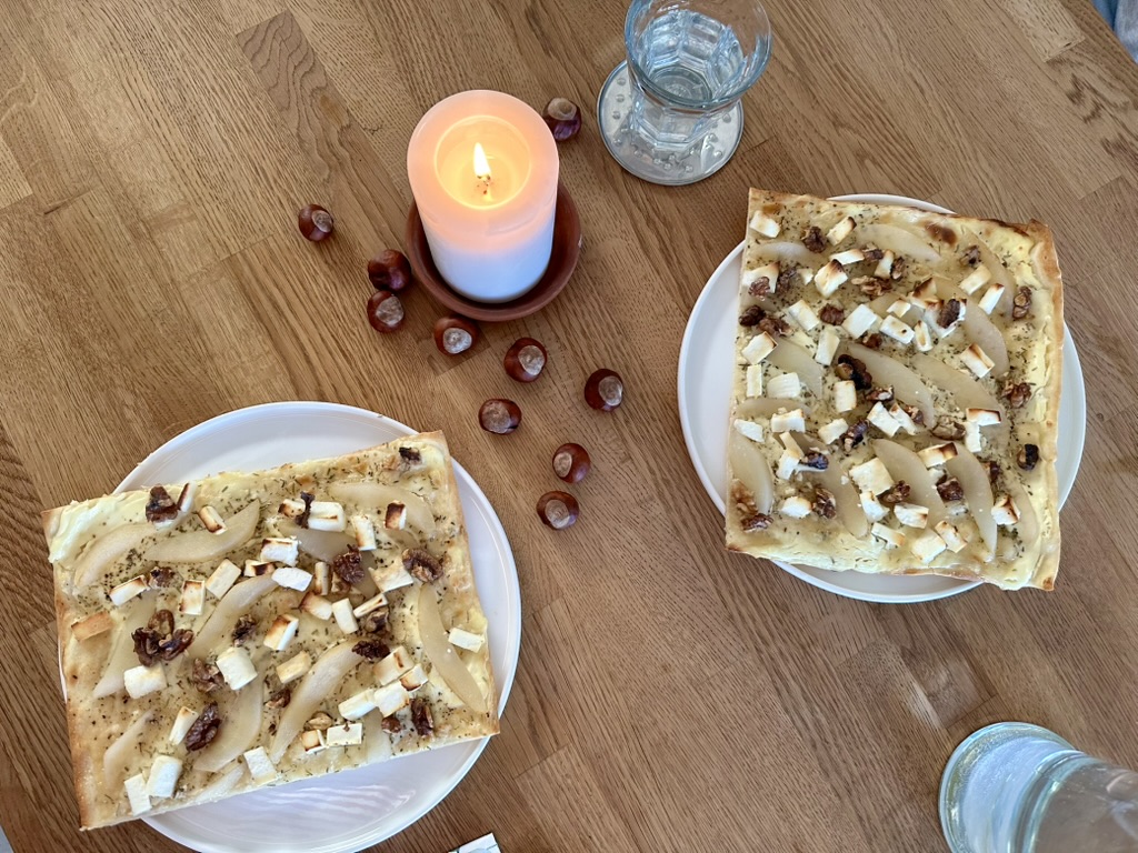 Flammkuchen mit Birnen, Ziegenkäse und Walnüssen