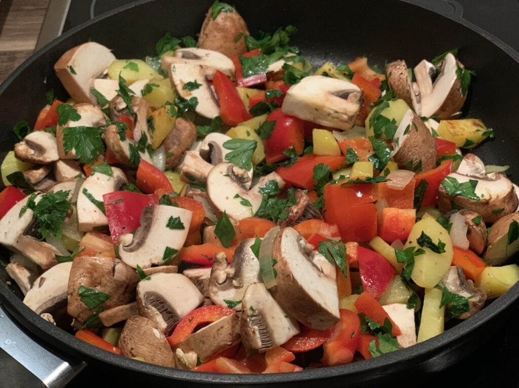 Das Gemüse schnibbeln und je nach Gar-Dauer der Sorte mit etwas Olivenöl in der Pfanne anbraten. Wenn ich Kartoffeln mit rein nehme, kommen die geschnittenen Kartoffelwürfel zuerst bei geringer Hitze mit Deckel für 20 Minuten in die Pfanne. Danach nehme ich den Deckel weg und gebe die übrigen klein geschnittenen Gemüsesorten inkl. 1/2 der gehackten Petersilie bei stärkerer Hitze dazu.