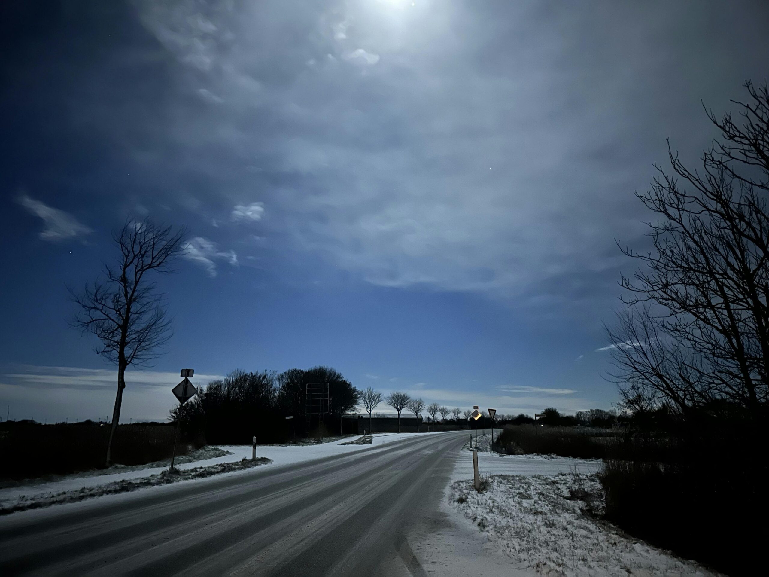 Leider waren die Voraussetzungen nicht die besten: Der Vollmond leuchtete den Himmel sowieso schon sehr aus, der Schnee reflektierte das Licht und dann zogen noch Wolken auf. Ich konnte also keine Sternschnuppen ausmachen. Egal! Einen Versuch war es wert und es war trotzdem toll, bei diesem besonderen Licht eine Weile in der Landschaft zu stehen und in den Nachthimmel zu sehen.