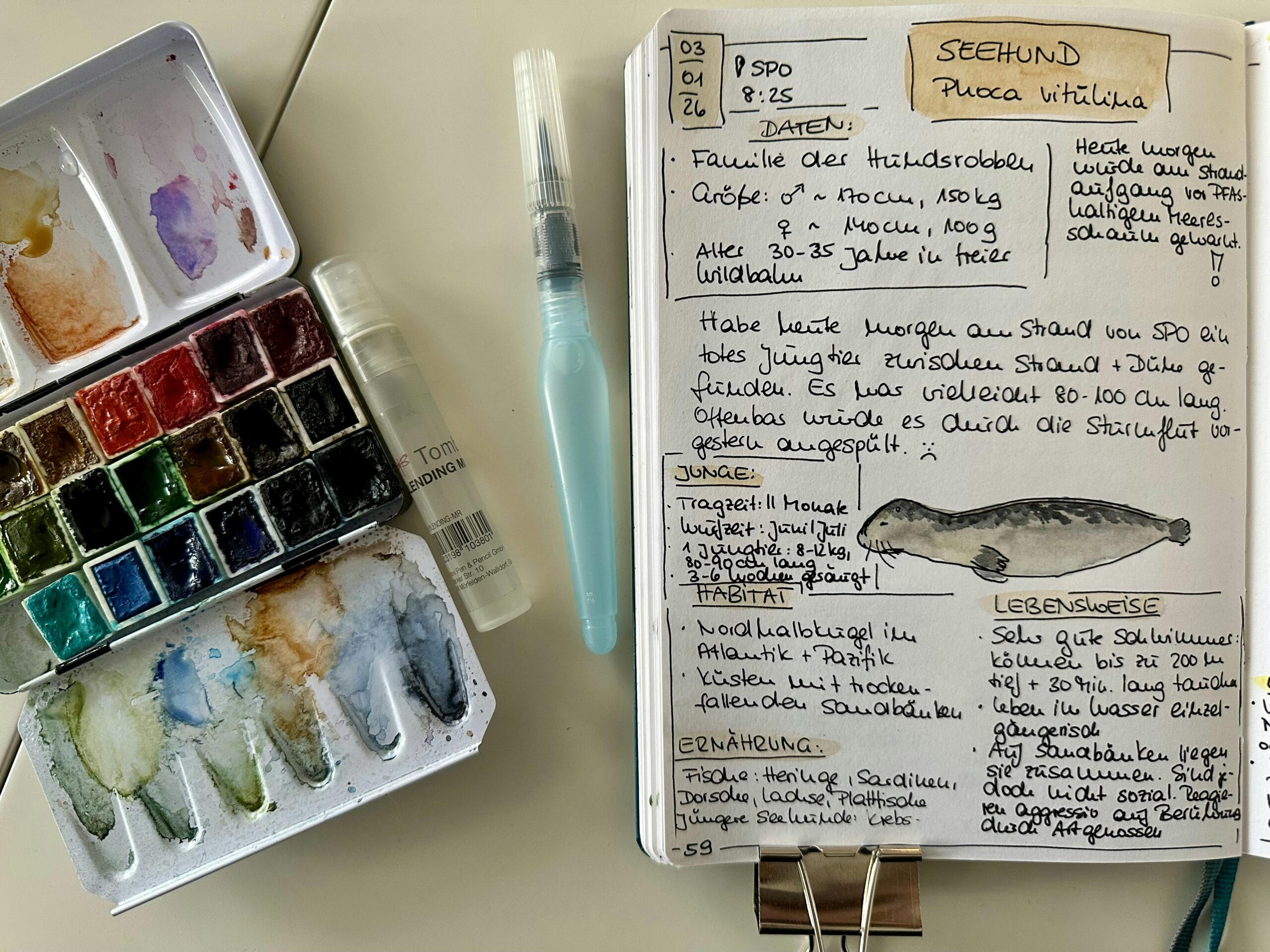 Gleichzeitig war ich fasziniert, dass ich so ein schönes Tier mal in Ruhe aus der Nähe betrachten konnte. Das hat mich inspiriert, mich zurück in der Ferienwohnung direkt mit Seehunden zu beschäftigen und habe das in meinem Nature Journal verewigt.