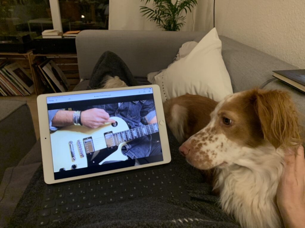 Lise scheinen die Gitarrenklänge ganz gut zu gefallen. Als ich die Gitarre gestimmt habe und die ersten Töne angestimmt habe, lag sie ziemlich entspannt neben mir auf der Couch. Als sie allerdings am nächsten Morgen ins Wohnzimmer kam und die Gitarre auf ihrem Ständer stehen sah, hat sie gebellt und geknurrt. Das war ihr dann doch komisch. Wir haben den Eindringling aber dann gemeinsam inspiziert und jetzt verträgt man sich.