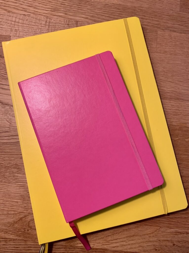 Das große gelbe Skizzenbuch habe ich für die Kreative Auszeit gekauft und in das pinke kommen meine Zeichnungen mit den schönsten Momenten des Tages.