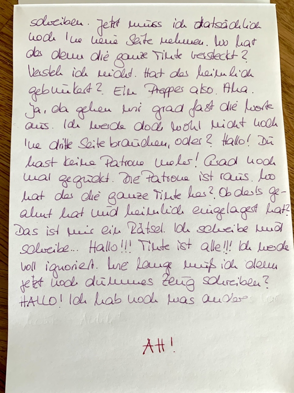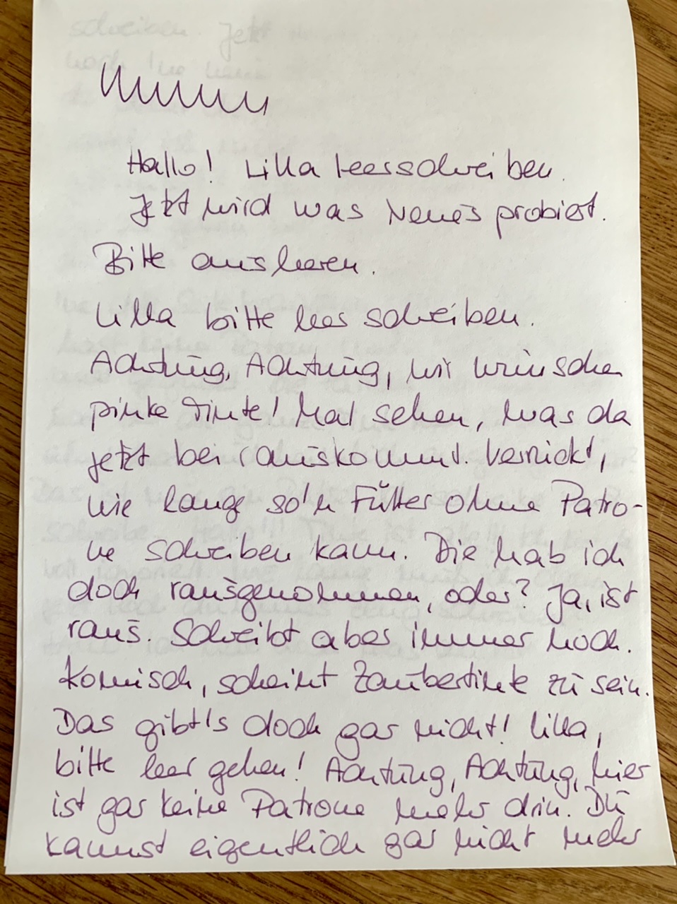 Überraschend fand ich beim Patronen-Tausch, wie lange so ein Füller noch schreibt, obwohl keine Patronen mehr drin waren. Meinen Leerschreib-Text teile ich hier mal mit Dir. Ich musste hinterher selbst ein wenig über mich lachen.