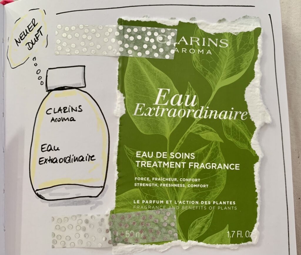 Ich liebe es ja aktuell, in mein Dankbarkeitstagebuch zu skizzieren und zu kleben. Auch wenn die Zeichnungen keinen Preis bekommen, es macht doch viel mehr Spaß, durch das kreativ gestaltete Buch zu blättern als nur eine geschriebene Liste zu lesen. Der Ausriss von der Verpackung hat noch einen Spritzer vom Duft bekommen. Und jetzt riecht die Kladde auch noch toll.