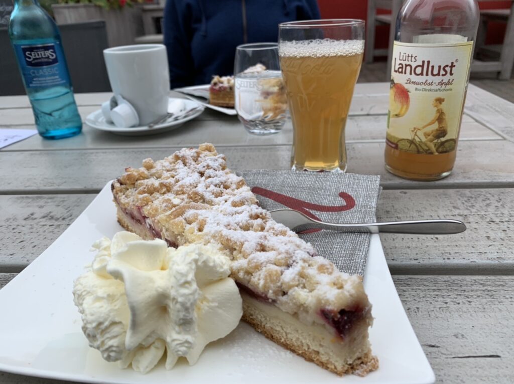 Auf unserer Runde kamen wir den ganzen Winter immer am Café Mowwe vorbei, was natürlich wegen des Lockdowns geschlossen war. Aber jetzt ist es wieder auf, wir hatten Durst und Appetit und so haben wir spontan eine Pause dort eingelegt und uns einen leckeren Pflaumenkuchen gegönnt.