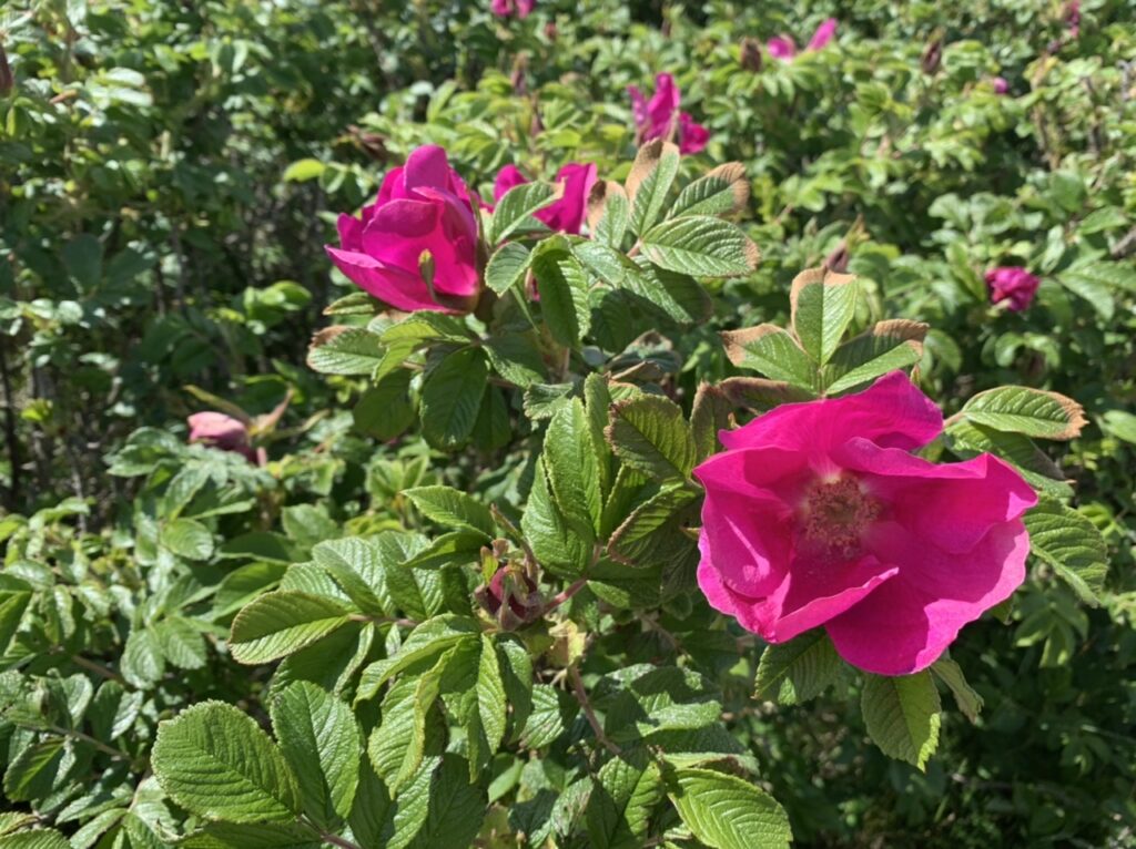 Wenn ich auf der Couch sitze und lese, sehe ich zwischendurch aus dem Fenster und sehe neben mir Strandhafer und Dünenrosen.