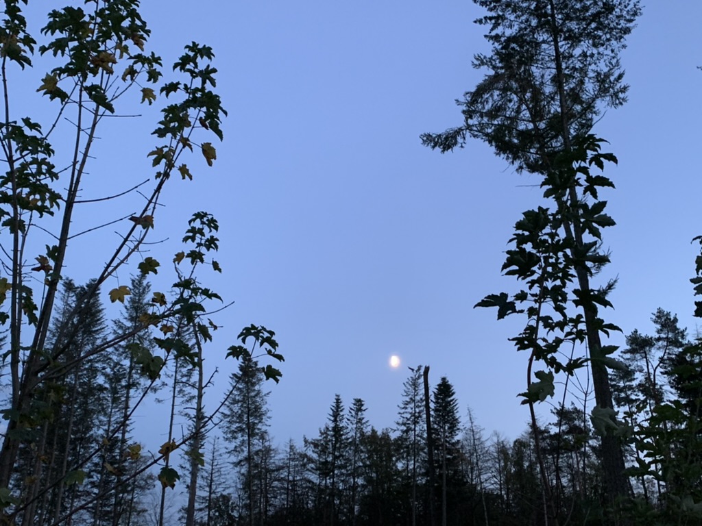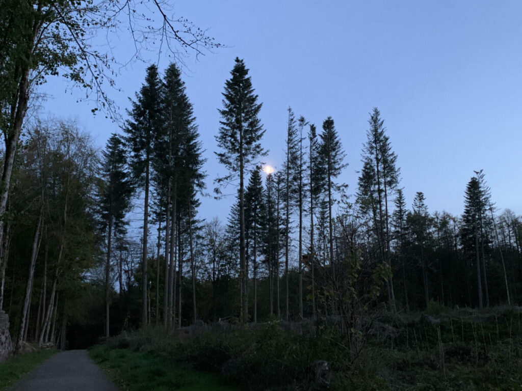 - Ein Feierabend-Spaziergang mit Tina, an dessen Ende es schon ziemlich dunkel wurde und der halbvolle Mond sich am Himmel zeigte.