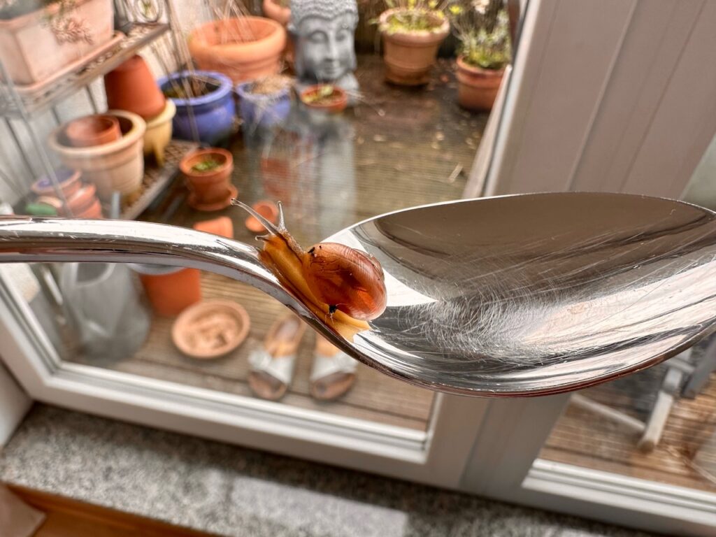 Die Töpfe hatte ich vom Balkon geholt und nach dem Abwaschen eines Untertellers im Spülbecken machte sich da plötzlich eine kleine Schnecke auf den Weg. Das war total schön, sie zu beobachten wie sie sich da mit ihren lustigen Fühlern über meine Spüle bewegte. Sie war komischerweise gar nicht scheu. Von draussen kenne ich es, dass sie sich sofort zurück in ihr Häuschen verziehen, wenn man ihnen zu nah kommt. Aber diese hatte sich offenbar durch ihre Zeit auf der Terrasse schon an mich gewöhnt.