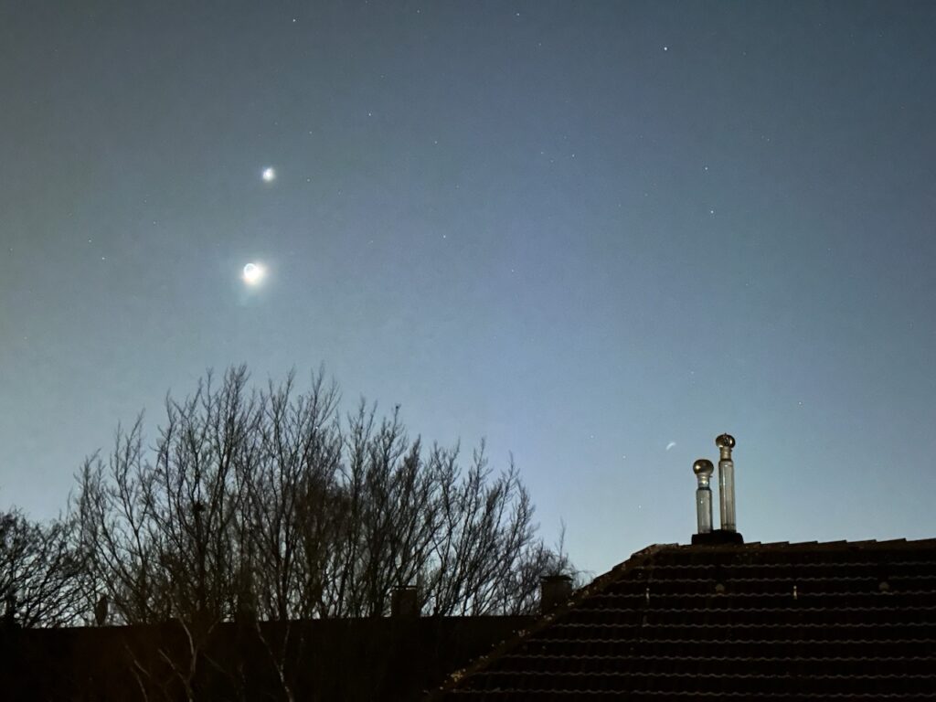 Die sogenannte „Planetenparade“ ist noch in vollem Gang und da es wieder klare Nächte gab, konnte ich diesmal noch mehr Sterne sehen als vorletzte Woche. Gegen 19 Uhr hab ich mich mit Wintermantel und Mütze auf meine Dachterrasse gestellt und habe in den dunklen Winterhimmel geschaut. Obwohl ich mitten in der Stadt wohne, wo es ja nie richtig dunkel ist, konnte ich am Himmel viel erkennen, nachdem ich die Lichter in meiner Wohnung ausgemacht hatte und meinen Augen einen Moment gegönnt habe, sich an die Dunkelheit zu gewöhnen.