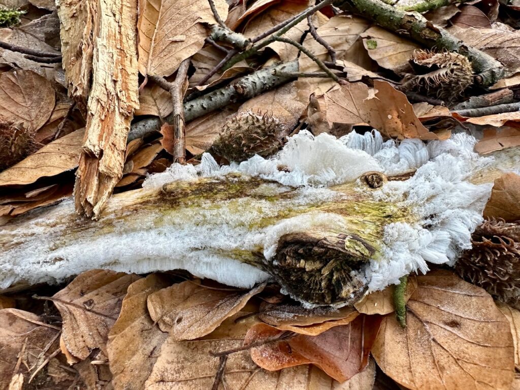 Falls du das Phänomen von Haareis nicht kennst: Das ist gefrorenes Wasser an Totholz, das wie weißes Haar oder Fell aussieht.