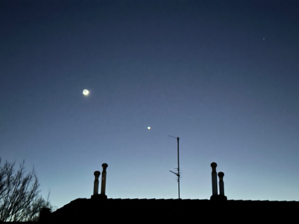 Hier Sonntagabend mit der Mondsichel (aus der das iPhone irgendwie immer einen Vollmond macht) und der Venus rechts.