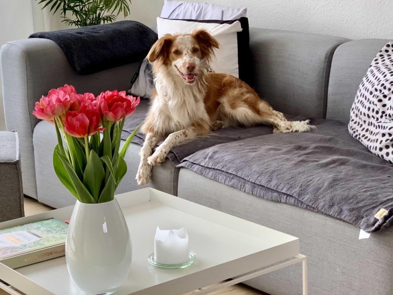 Da die Bilder von Lise immer so gut ankommen, habe ich heute als Titelbild noch mal eins mit dem kleinen Hund drauf genommen. 😉 Aber ich finde, sie macht sich auch echt gut da hinter den wilden Tulpen.