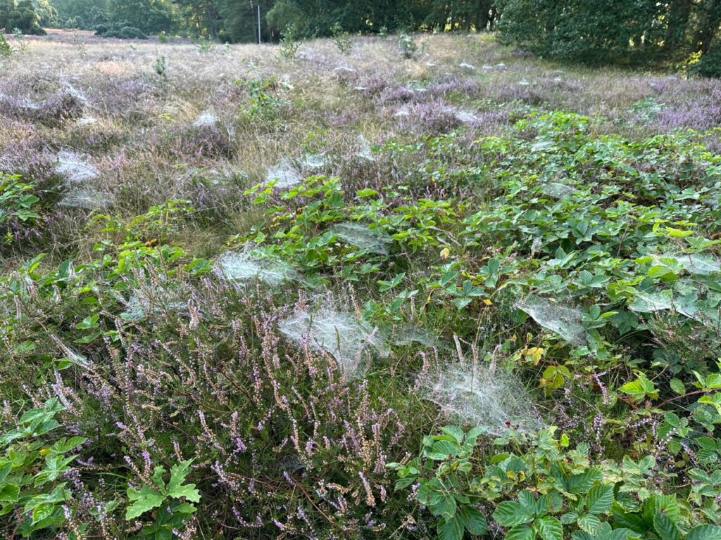 Am Montag hab ich mich mit einer Freundin in Haltern getroffen. Ich war schon früh da und habe dort mit Lise die erste große Runde des Tages durch die Westruper Heide gedreht. Die Spinnweben dort waren durch den Tau so schön zu erkennen.