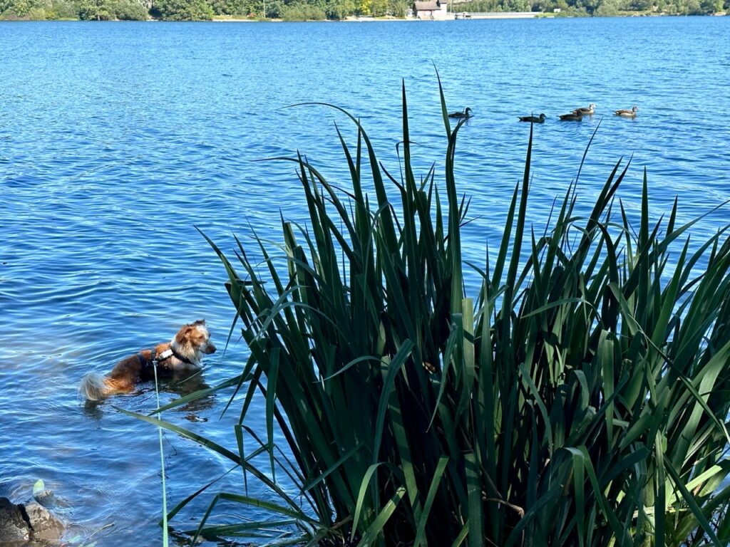 Hier kann man schön laufen und baden. Lise hat später noch, trotz ihrer eher begrenzten Begeisterung für‘s Schwimmen, noch mal kurz nach den Enten geschaut. Sie ist erst energisch los gepaddelt und ich hatte das Gefühl, dass sie sich dann selbst erschrocken hat und schnell wieder zurück ans rettende Ufer gekommen ist. Besonders weit wäre sie wegen der Leine eh nicht gekommen. 😉