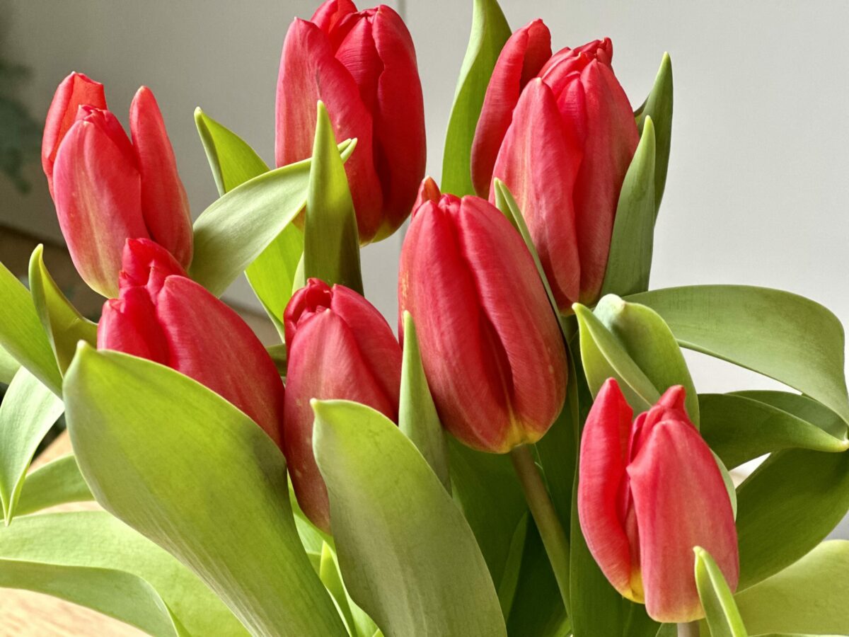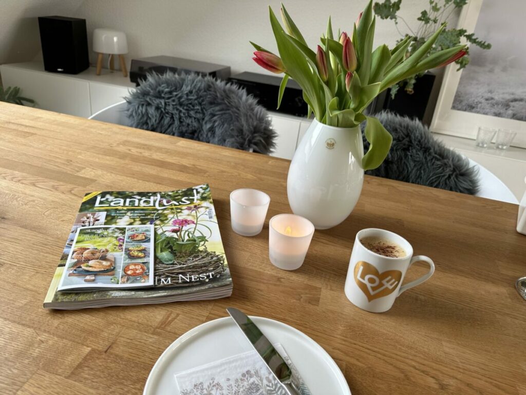 Und so hatte ich anschliessend ein wunderbar gemütliches Frühstück, bei dem ich mich über die Tulpen gefreut und mit dem Heft ein wenig in der Vorfreude auf den Frühling gebadet habe. Neben der Lektüre des Magazins habe ich dazu schon mal die Playlist „Frühlingserwachen in Hazelnut House“ von Theresa Baumgärtner gehört (das ist die Playlist zu ihrem wundervollen Buch „Frühlingserwachen“**). Die frischen Farben auf dem Tisch taten dem Auge echt gut!