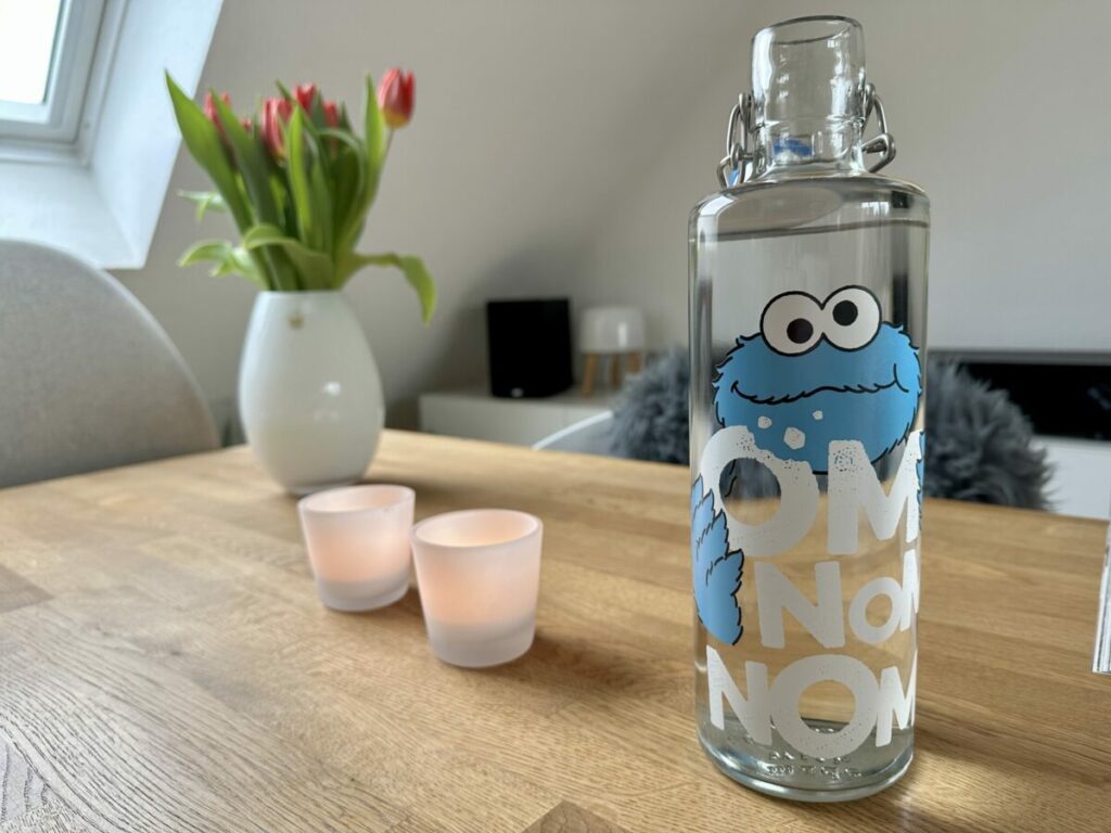 Soulbottle hat anlässlich des 50. Sesamstraßen-Geburtstags eine entsprechende Kollektion* herausgebracht. Daran bin ich nicht vorbei gekommen und hab mir die 1-Liter-Krümmelmonster-Flasche gekauft. Das Innere Kind jauchzt nun beim Trinken vor Vergnügen. 😉