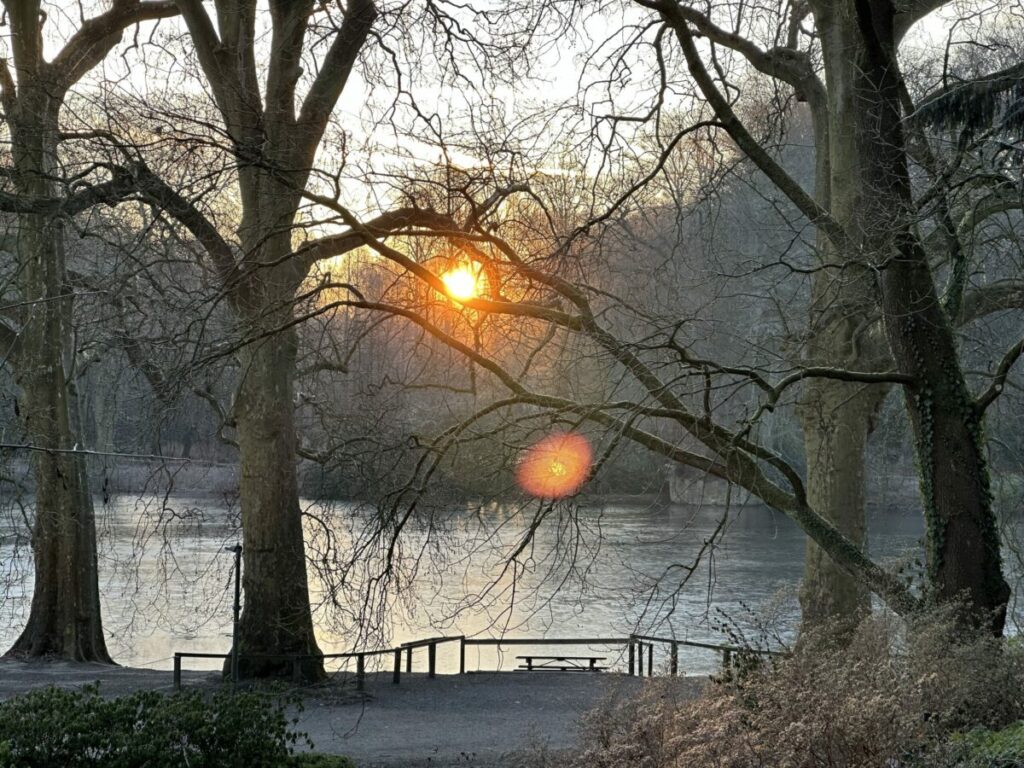 Der große Teich war leicht zugefroren und der Kontrast der orange-warmen Sonne zur kalten Umgebung war so schön: