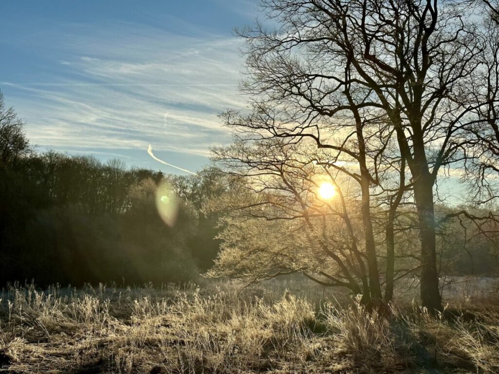 Da ich am Dienstag und Mittwoch viele „Drinnen-Termine“ hatte, hatte ich entschieden, an beiden Tagen wenigstens morgens mit Lise eine Runde durch den Rombergpark zu machen statt der üblichen Waldrunde. Hier war es noch frostig und die Sonne war bereits auf ihrem Weg.