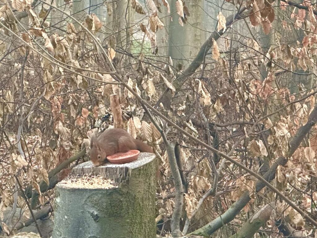- Nachdem ich mich letzte Woche über das kleine Rotkehlchen an der Futterstation im Wald gefreut habe, konnte ich dort diese Woche ein Eichhörnchen beobachten. Toll!