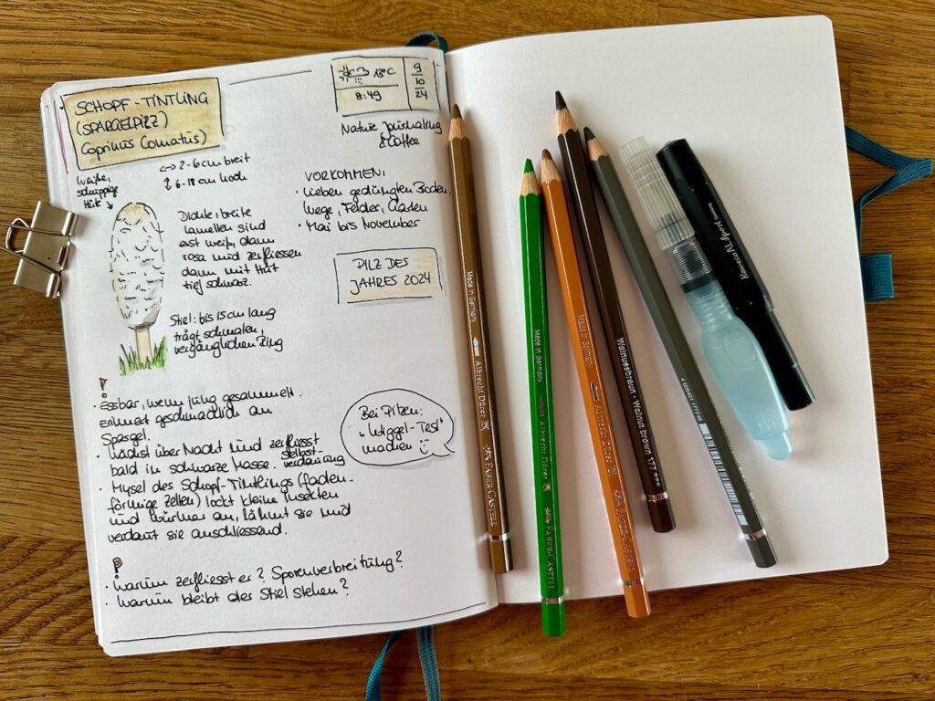 Und am Mittwoch haben wir dann online bei „Nature Journaling & Coffee“ den Tintenschöpfling erforscht. Was für ein spannender Pilz: Der Hut zersetzt sich nach kurzer Zeit zu Tinte (daher der Name) und er killt und verdaut doch tatsächlich kleine Insekten und Würmer. Was für ein krasser Typ!