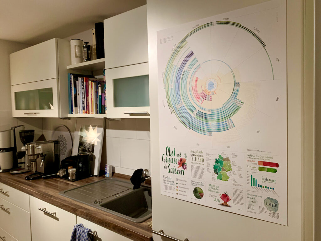 Schon länger hatte ich das Poster „Obst und Gemüse der Saison“ auf dem Schirm. Ich weiß nie, wann welches Gemüse grad Saison hat und ob ich mich mit meinem Lieblingsgemüse beeilen muss. Und dieses Poster bietet eine schöne Übersicht und sieht dazu noch toll aus! Ich hab so lange mit dem Kauf gezögert, weil ich in der Küche keinen Platz für einen Bilderrahmen habe. Aber jetzt hängt es direkt am Kühlschrank und ich freu mich voll über die frischen Farben und die nützlichen Infos!
