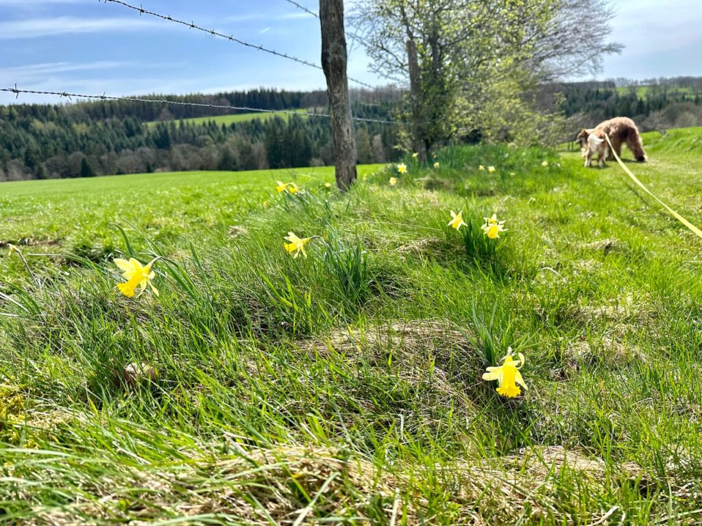 Und so traf ich mich am Samstag noch mal mit Brigitte und ihrer Hündin Fleur, um eigentlich in die Narzissen zu gehen. Als wir uns relativ spät trafen, strömten schon ziemlich viele Menschen zu den Narzissenwiesen. Ich hatte uns einen anderen Weg ausgesucht, der dann – wie sich später rausstellte – nicht durch die Narzissen ging, aber dafür trotzdem wunderschön und vor allem ziemlich leer war.