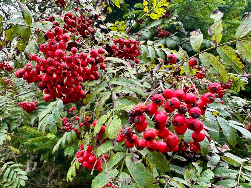 Heute ist die Energie im Wald ganz anders: Die Vögel singen viel, viel weniger. Auch sie haben ein anstrengendes Jahr mit Partnersuche, Nestbau, Aufzucht der Jungen und Mauser hinter sich. Einige von ihnen sind schon auf dem Weg in den wärmeren Süden, andere starten jetzt und in den nächsten Tagen. Auch bei den Bäumen ist Rückzug erkennbar. Eichen und Buchen werfen gerade zahlreich ihre Früchte ab, so dass man an stürmischen Tagen fast mit Helm in den Wald muss. 😉 Manche Blätter werden schon trocken und braun. Der Holunder und die Eberesche präsentieren noch ihre Beeren, bevor sie sich dann auch bald zurückziehen werden.