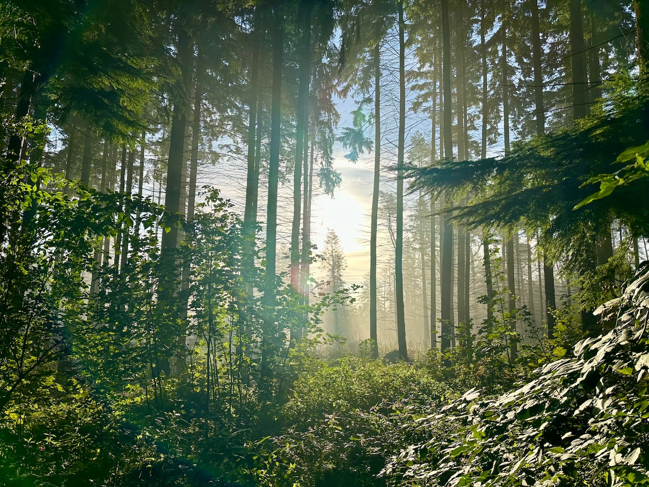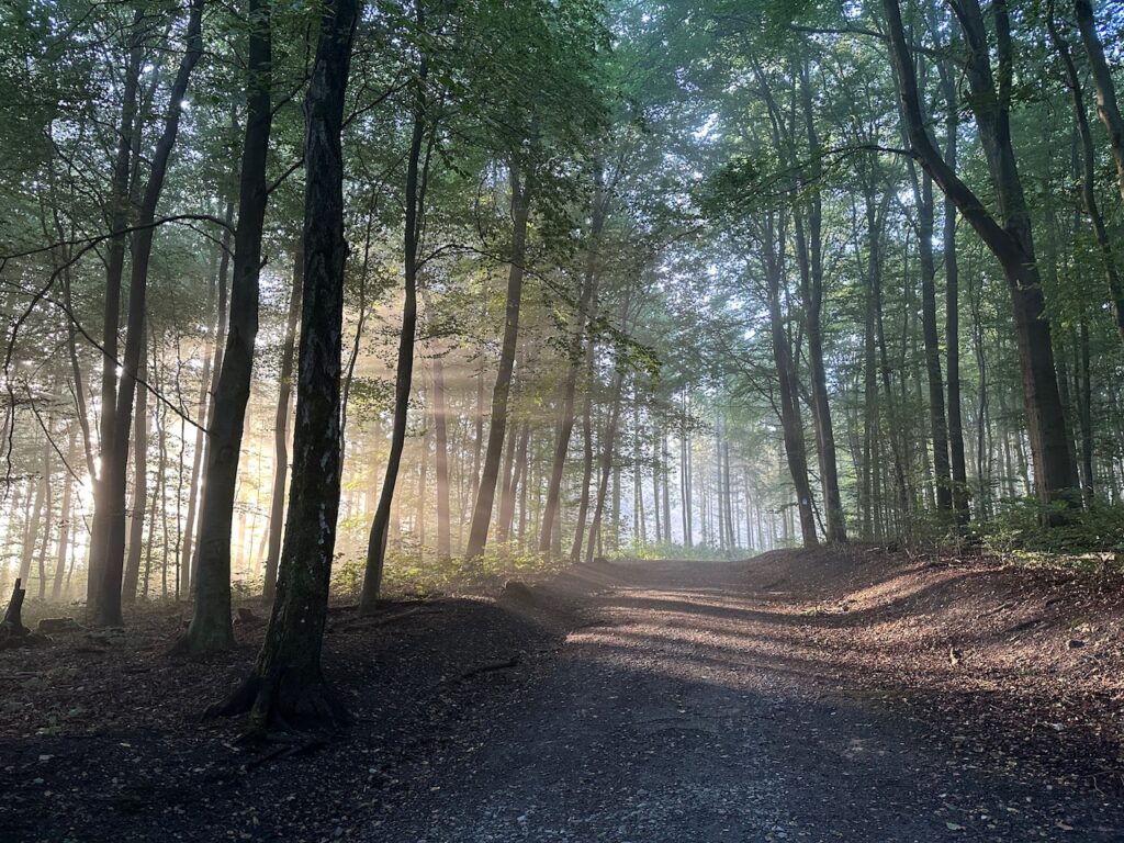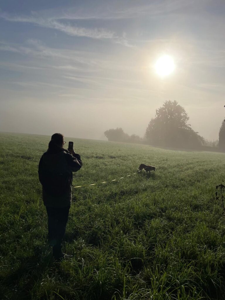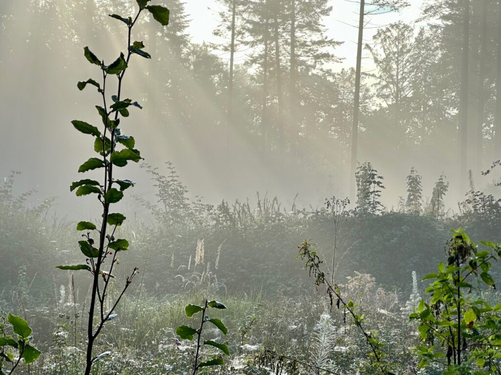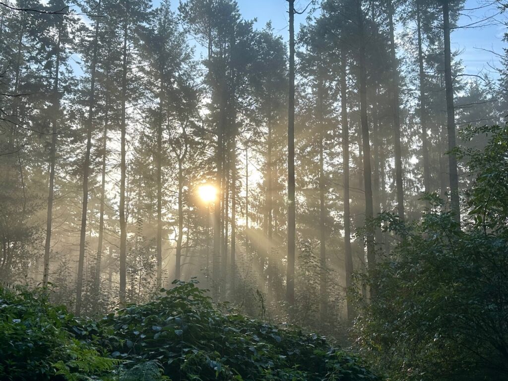 Besonders begeistert hat mich der Freitagmorgen im Wald. Schon auf dem Weg zum Wald sah ich, dass sich wieder Bodennebel gebildet hatte und ich so freute ich mich besonders auf diese Runde. Im Wald lag dann viel Nebel, das Licht fiel durch die Bäume und es sah einfach fantastisch dort aus.