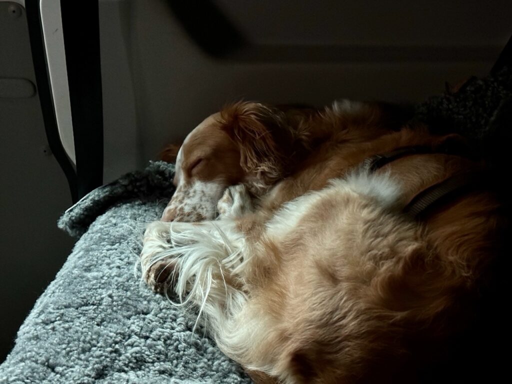 Mittlerweile ist es etwas kühler, aber meine neue Ausstattung für die kühlere Jahreszeit hat sich echt gelohnt. Die Flanell-Bettwäsche ist super kuschelig und es ist mit der richtigen Kleidung immer noch gemütlich im Bulli. Auch die Felle sind super; Lise gefällt es auf ihrem offensichtlich auch sehr gut. 😉