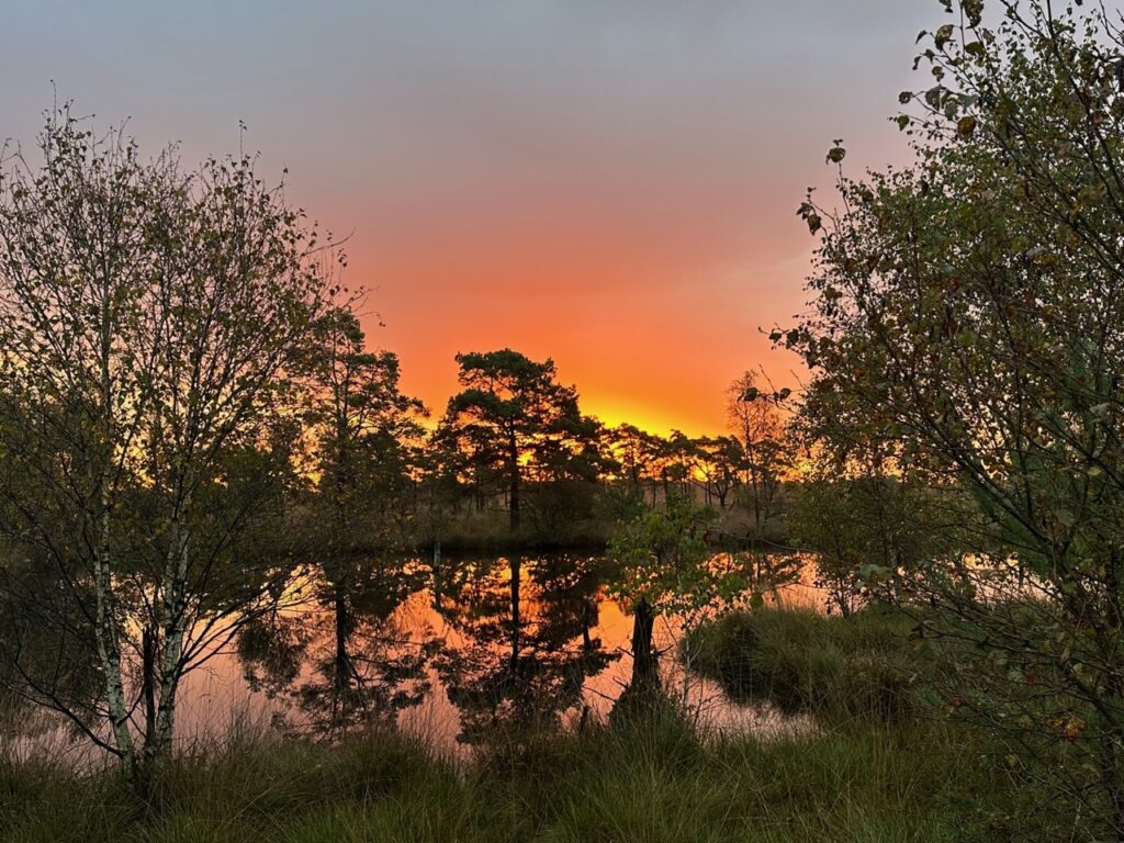 Der Himmel wurde immer roter und die Stimmung war einfach toll! Irgendwo auf einer der Wiesen sassen offenbar Kraniche, die ihren Ruf durch das ganze Moor hallen liessen.