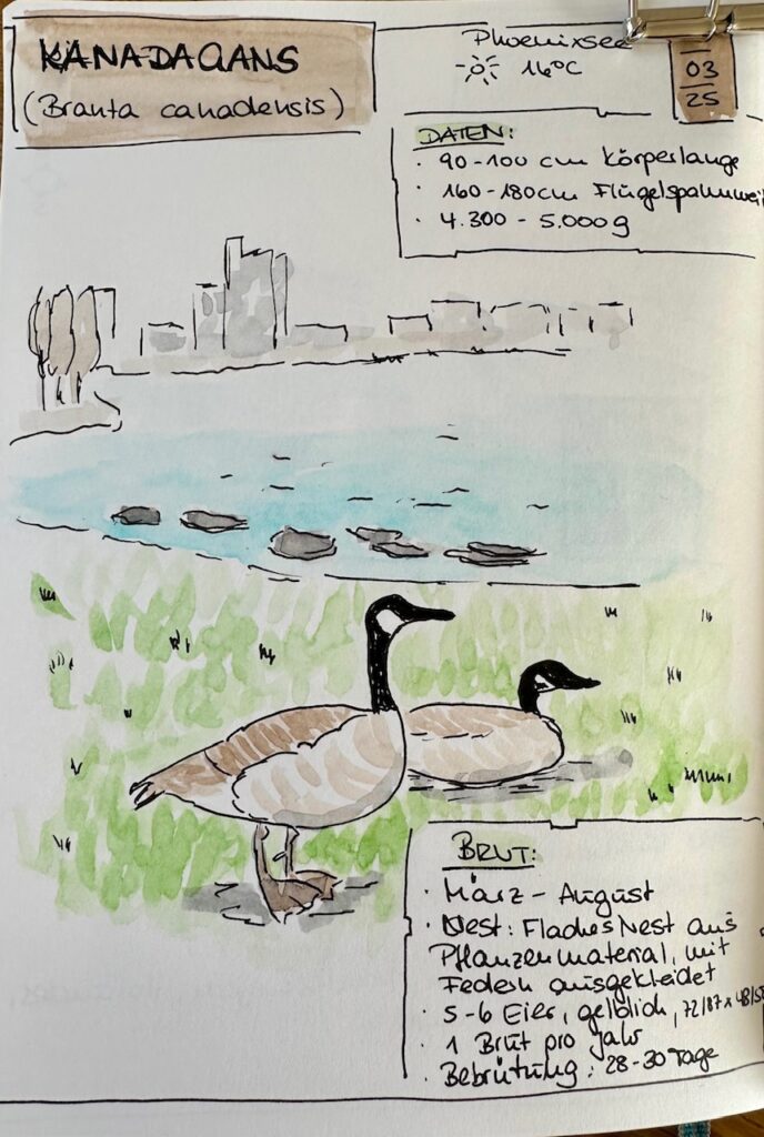 Am Montag hab ich mit Martina einen schönen Ausflug zum Phoenixsee in Dortmund gemacht. Wir sind nur ein kurzes Stück gelaufen und haben uns dort auf einer der Sitzplattformen niedergelassen und die Kanadagänse gejournalt, die dort unterwegs waren.