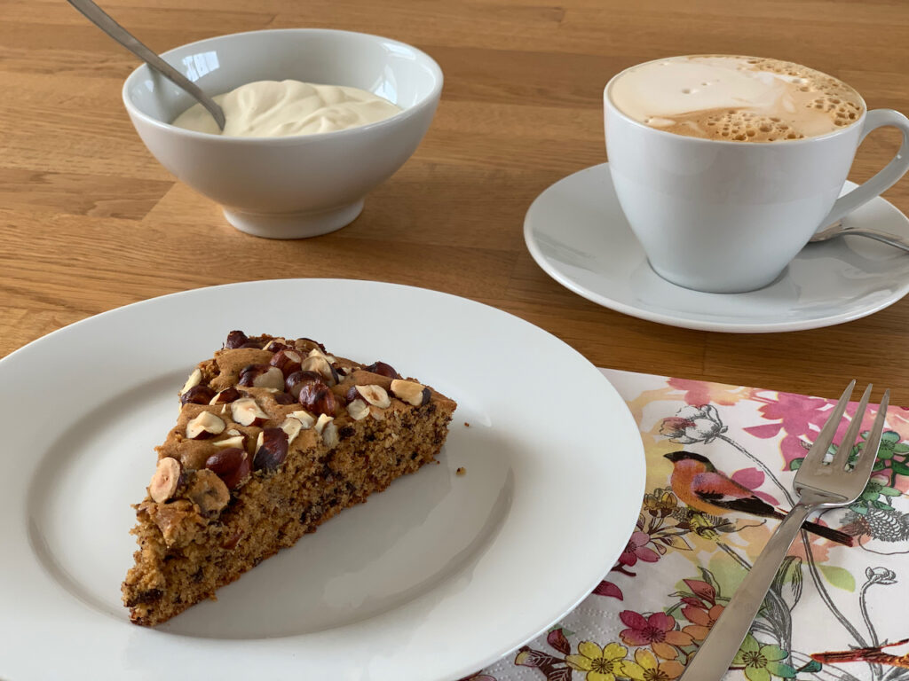 Der Kuchen ist super lecker, er enthält nur wenig Zucker (80 g gesamt) und schmeckt herrlich nach Nüssen und Orangen.