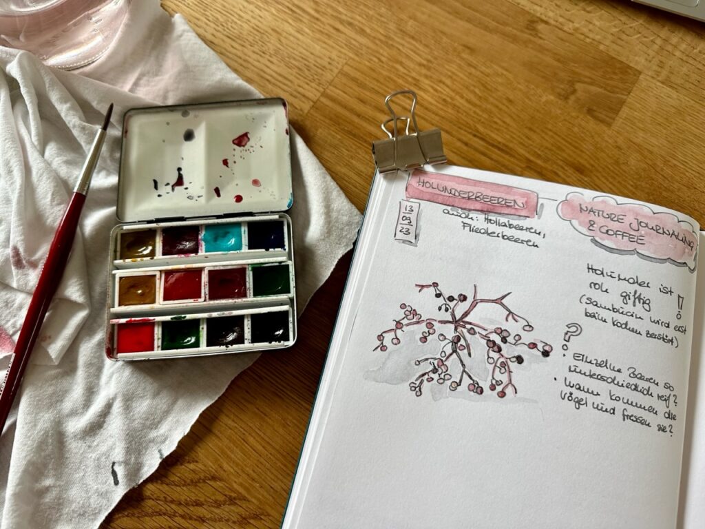 - Ein Morgen „Nature Journaling & Coffee“ mit Verena bei Youtube, bei dem wir Holunderbeeren gemalt und erforscht haben.