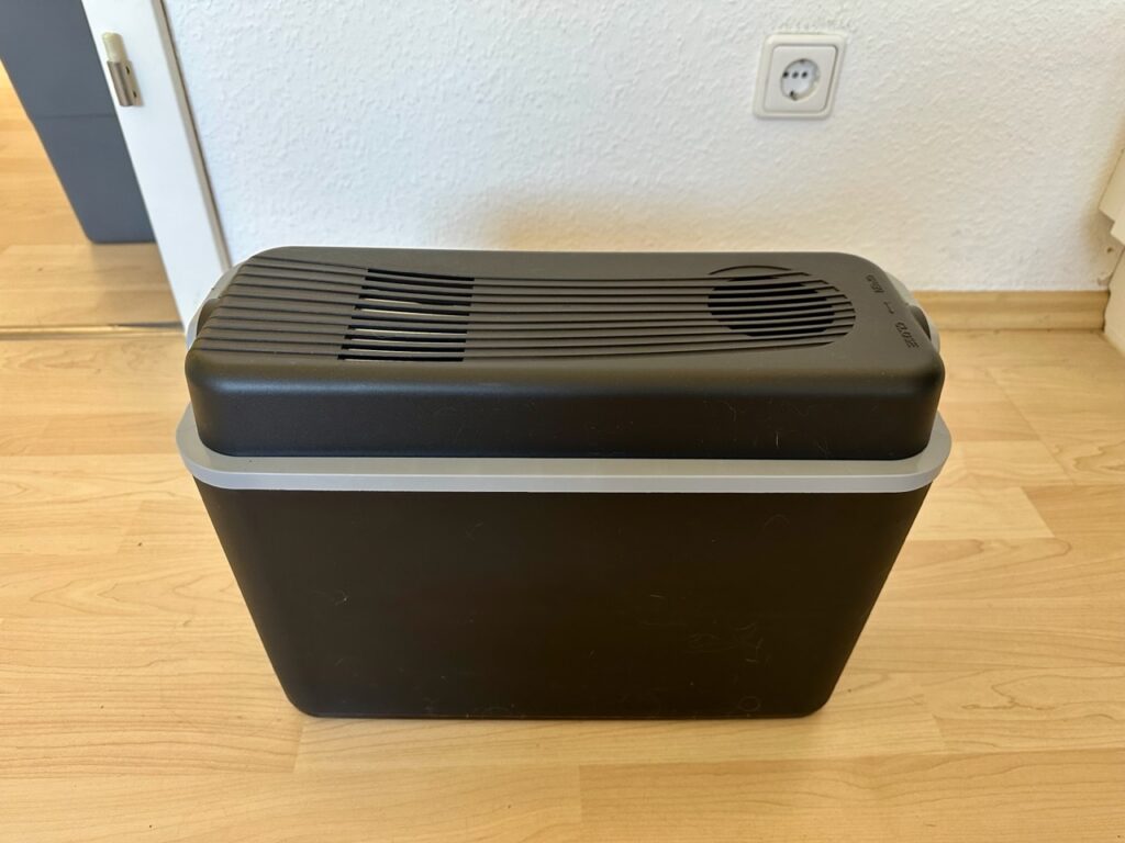 Eingezogen ist eine neue Kühlbox für den Bulli. Ich hatte im Frühling eine gekauft, die vollständig überdimensioniert war für das wenige, das bei mir unterwegs gekühlt werden muss. Nun hab ich eine kleine 12-Liter-Box mit Anschluss für den Zigarettenanzünder gefunden und bin total happy, weil ich die kleine Box so vor dem Beifahrersitz transportieren kann und sie nicht mehr im Innenraum im Weg steht.