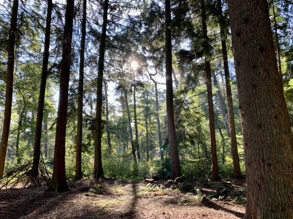 - Bei der sonntäglichen Morgenrunde im Wald den Sonnenschein geniessen.