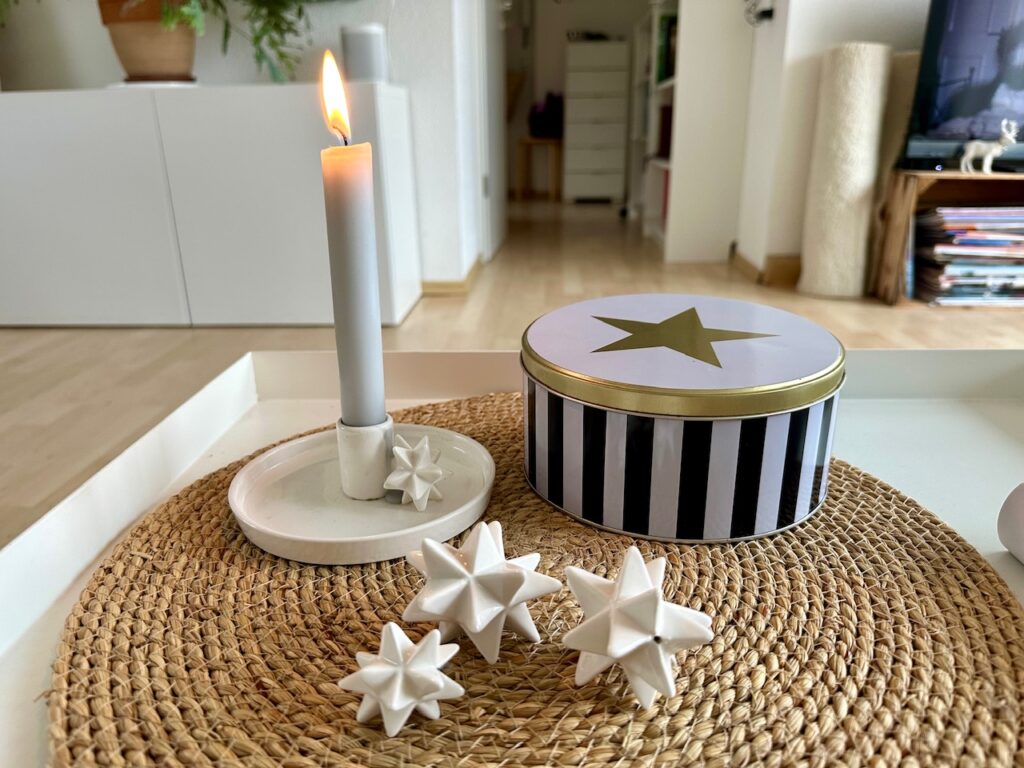 Nachdem ich letzte Woche schon die Lichterkette auf der Terrasse in Betrieb genommen habe und den Stern im Fenster aufgehängt habe, dufte der Rest dann auch wieder rauskommen. So viel Deko gibt es bei mir ja eigentlich gar nicht mehr. Aber ich mag die winterlich-gemütliche Stimmung, die die wenigen Teile verbreiten.