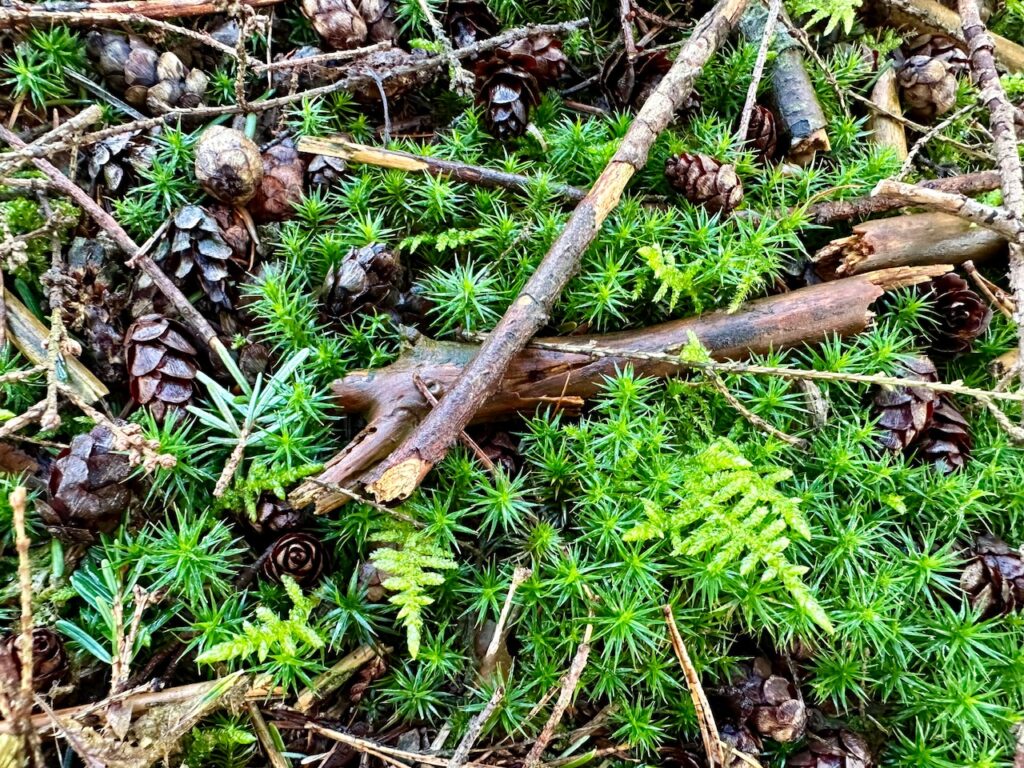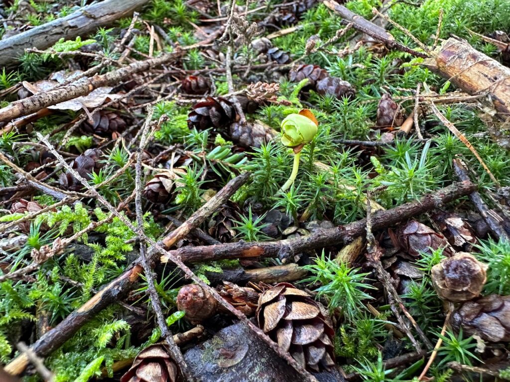 Und vor allem beim genaueren Blick auf die Böden gibt es viel neues Leben zu entdecken. Unter den Kanadischen Hemlocktannen bei mir im Wald war schon einiges los. Dieser zarte Trieb war vielleicht 3 cm hoch und im Stehen kaum zu erkennen. Zum Vergleich: Die kleinen Zapfen der Hemlocktanne am Boden sind vielleicht 2, maximal 3 cm lang. Man muss sich also bücken, um das kommende Leben in den Wäldern zu entdecken.
