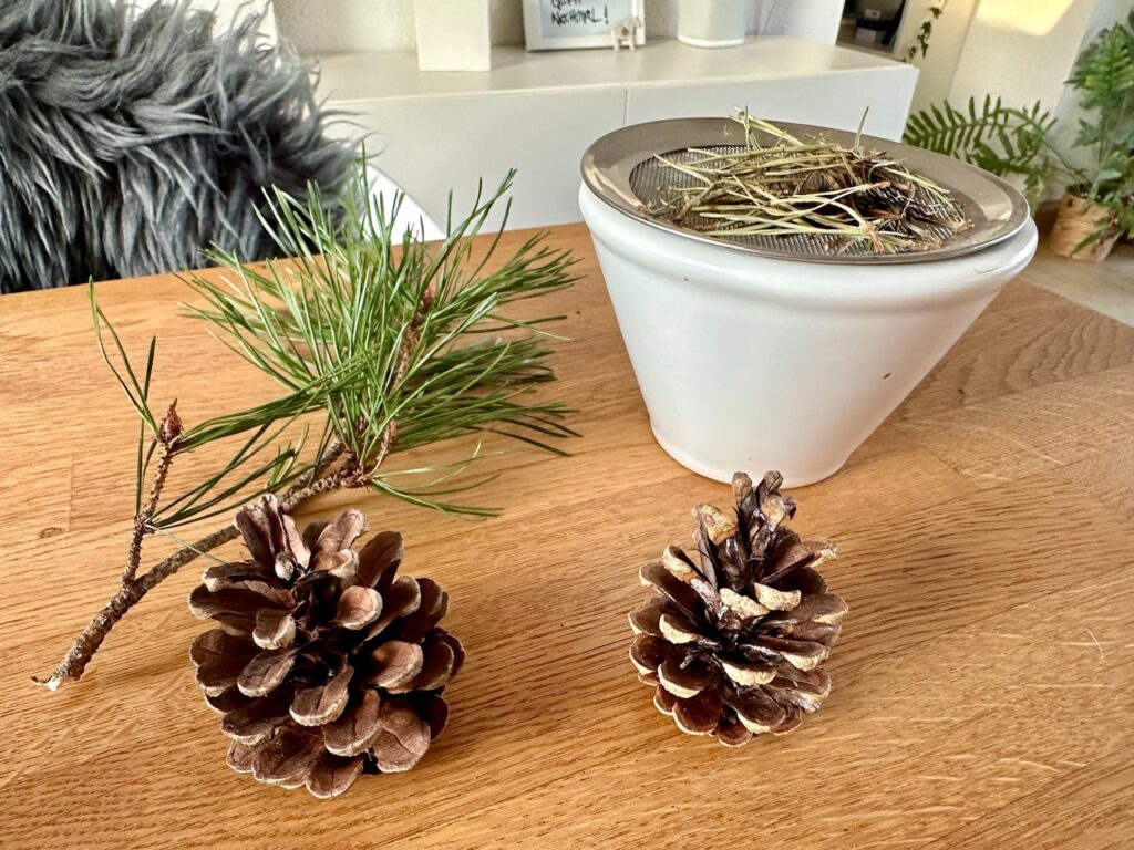 Für Zuhause habe ich dann einen kleinen Zweig mitgenommen, der auf dem Weg lag, Kiefernzapfen hatte ich im letzten Herbst schon gesammelt und ich hab getrocknete Kiefernnadeln auf meinem Räucherstövchen verräuchert, so dass ich mich mit der Waldkiefer auf vielen Ebenen beschäftigt habe.
