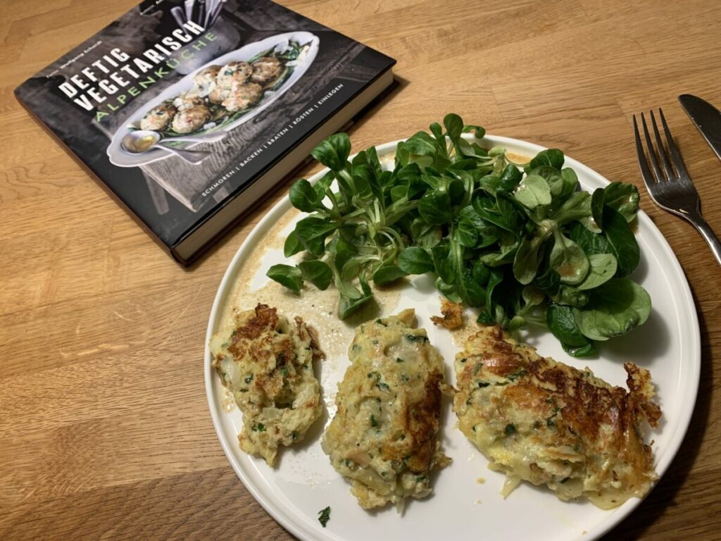- Aus dem Buch „Deftig vegetarisch – Alpenküche“** die Kaspressknödel ausprobiert zu haben. Also Knödel mit Käse. Und sie sind – obwohl ich einen Denkfehler bei der Brötchenmenge hatte – so lecker gewesen! Die gibt`s definitiv noch mal!