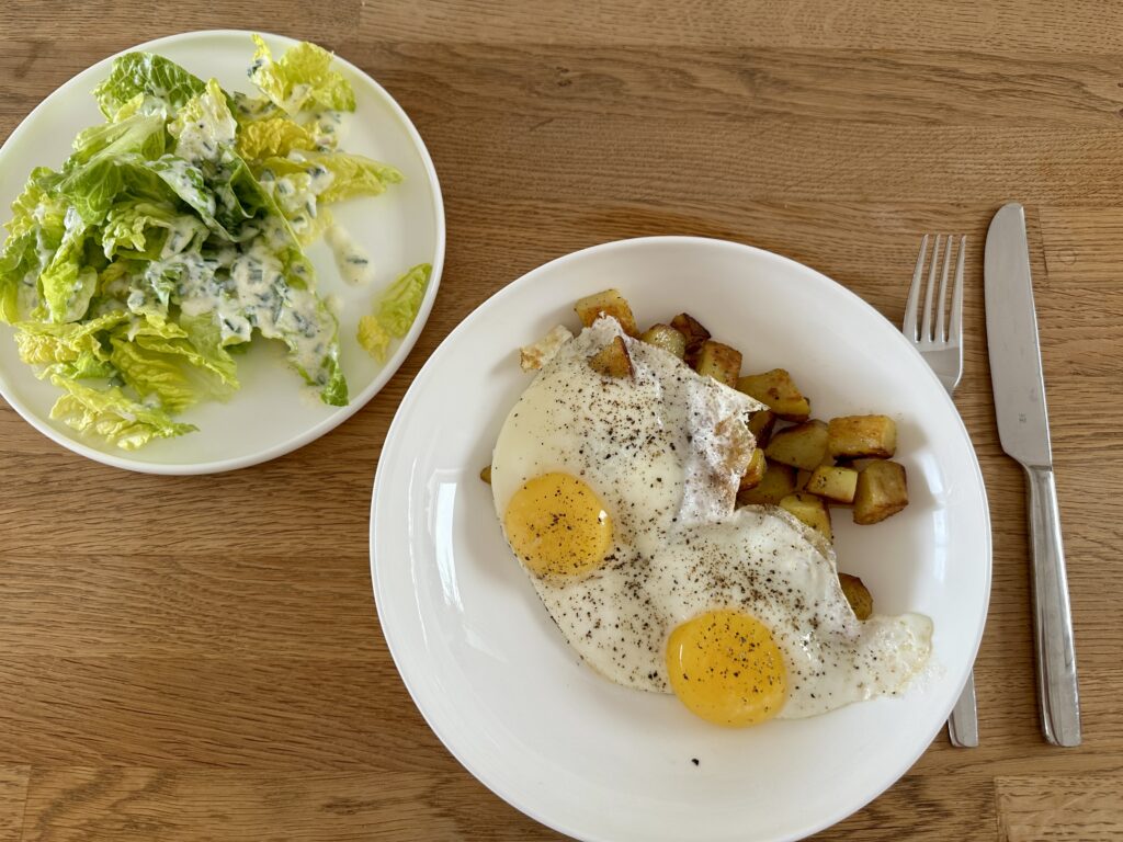 Einen Tag gab es Bratkartoffeln und Spiegelei mit Salat. Bratkartoffeln fand ich immer schwierig zu machen. Irgendwie wurden die Kartoffelscheiben nie so richtig knusprig. Irgendwann bin ich dazu übergegangen, sie nicht mehr in Scheiben, sondern in Würfel zu schneiden. Und bekomme ich dann doch auch endlich krosse Bratkartoffeln hin.