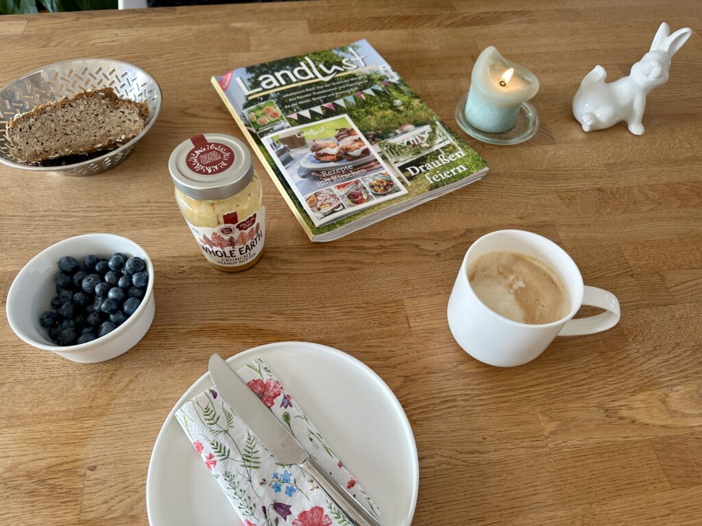 Dazu lief die Playlist „Frühlingserwachen in Hazelnut House“ von Theresa Baumgärtner. Die Playlist hatte sie seinerzeit mit ihrem Buch „Frühlingserwachen“ (hier gebraucht bei Medimops*) bei Spotify veröffentlicht. Ich hab sie mit rüber zu Deezer kopiert und erfreu mich immer um diese Jahreszeit daran. Ich finde, das ist die perfekte Frühstücks-Playlist für diese Jahreszeit. (Hier kannst du sie bei Deezer hören.)