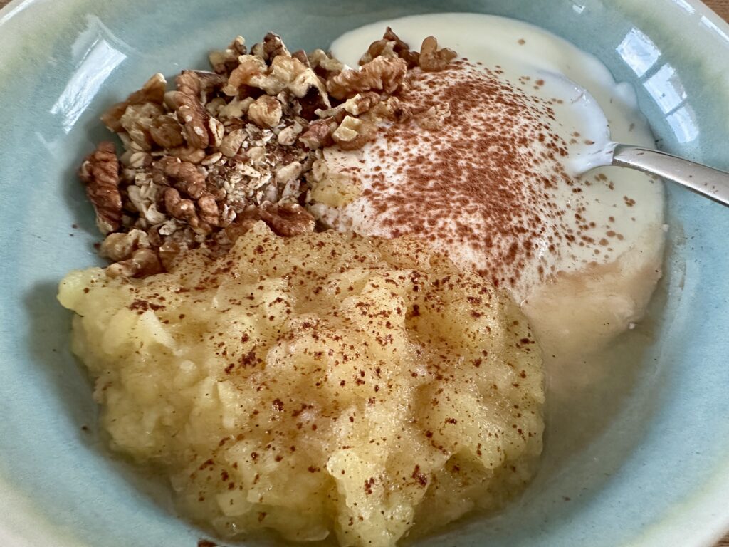 Ich hab mein selbstgemachtes zuckerfreies Müsli mit Naturjoghurt und frisch gekochtem, warmen Apfelkompott kombiniert. Darüber kamen ein paar zusätzliche Walnüsse sowie eine Mischung aus Backkakao und Zimt. Wunderbar für die Seele und noch dazu gesund!