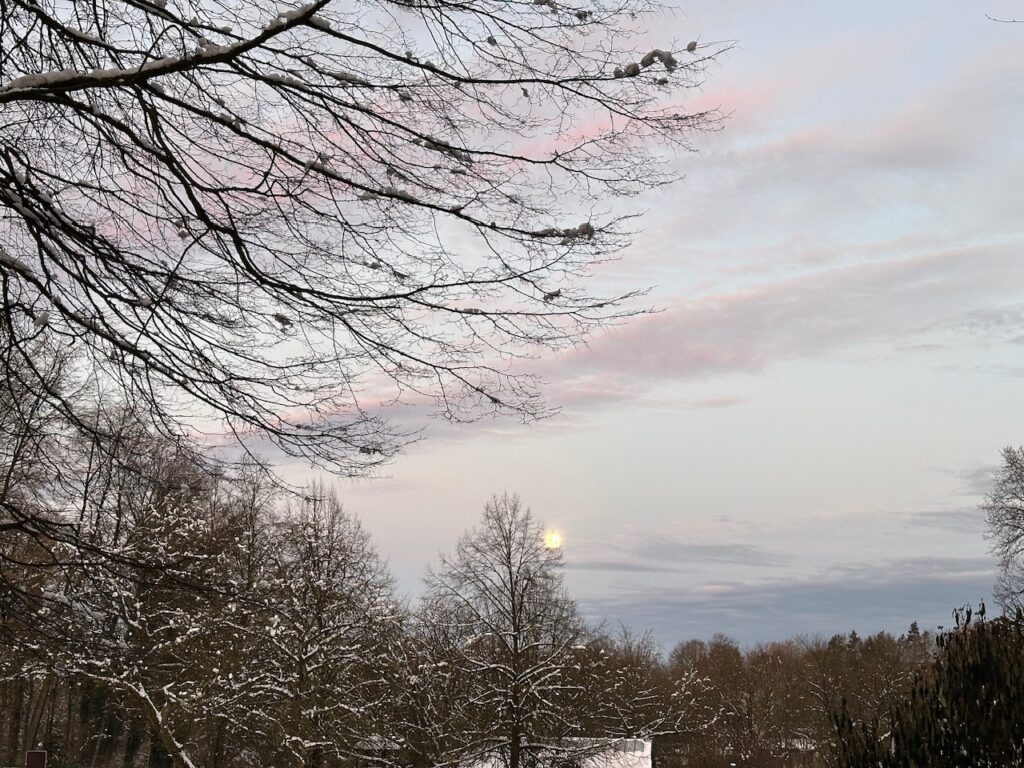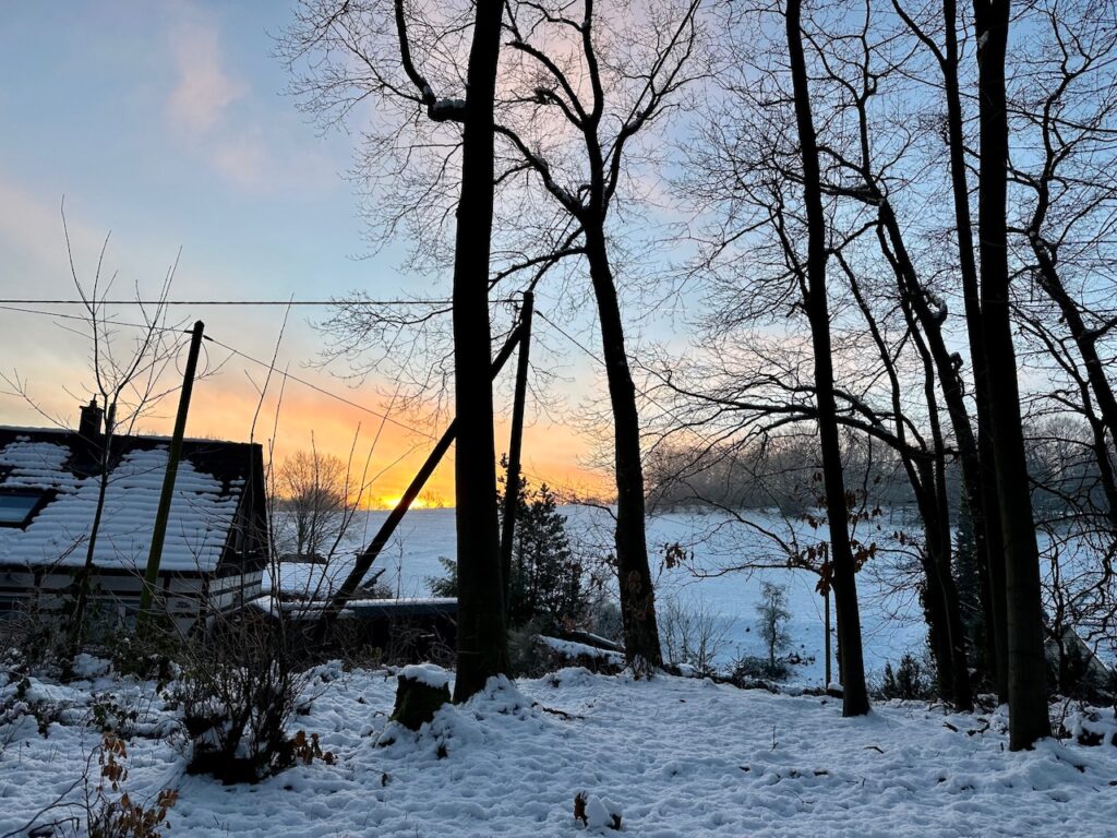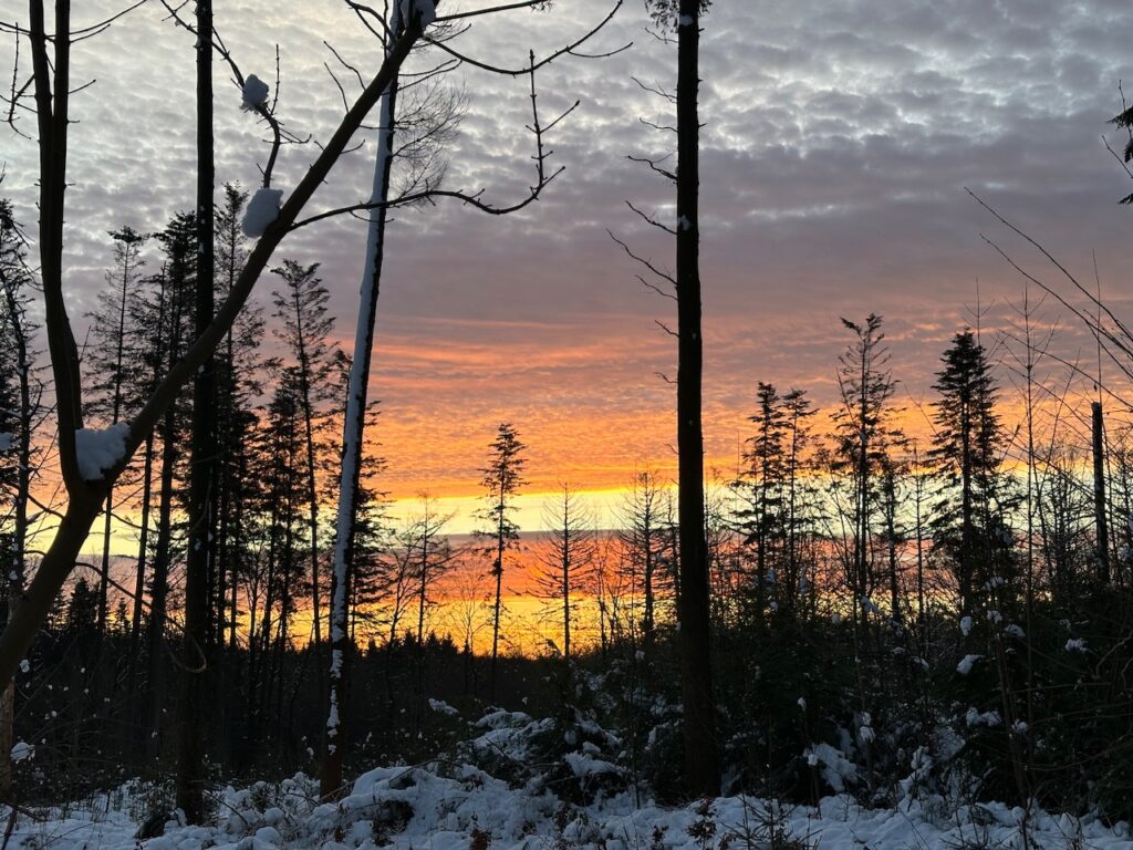 Es geht schon los, wenn ich morgens in den Wald fahre. Der Himmel ist oft so schön gefärbt. Es beginnt mit zarten Rose-Tönen, die dann immer kräftiger werden und später ein sattes Orange ergeben.