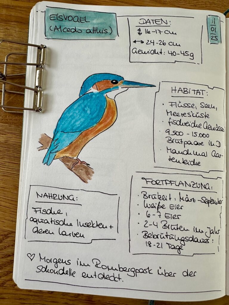 Und weil ich danach noch Zeit hatte, habe ich mich dann noch mit dem Eisvogel auseinandergesetzt, den ich am Morgen mit Lise überraschend im Park über den Bach „Schondelle“ hatte fliegen sehen. Über den habe ich mich sehr gefreut, denn ich hatte zuvor erst einmal einen beobachten dürfen. Der kleine knallblau-metallicfarbene Vogel mit dem orangefarbenen Bauch war zwar ruckzuck weg, so dass ich auch kein Foto machen konnte. Aber dafür hab ich jetzt eine Erinnerung in meinem Nature Journal.