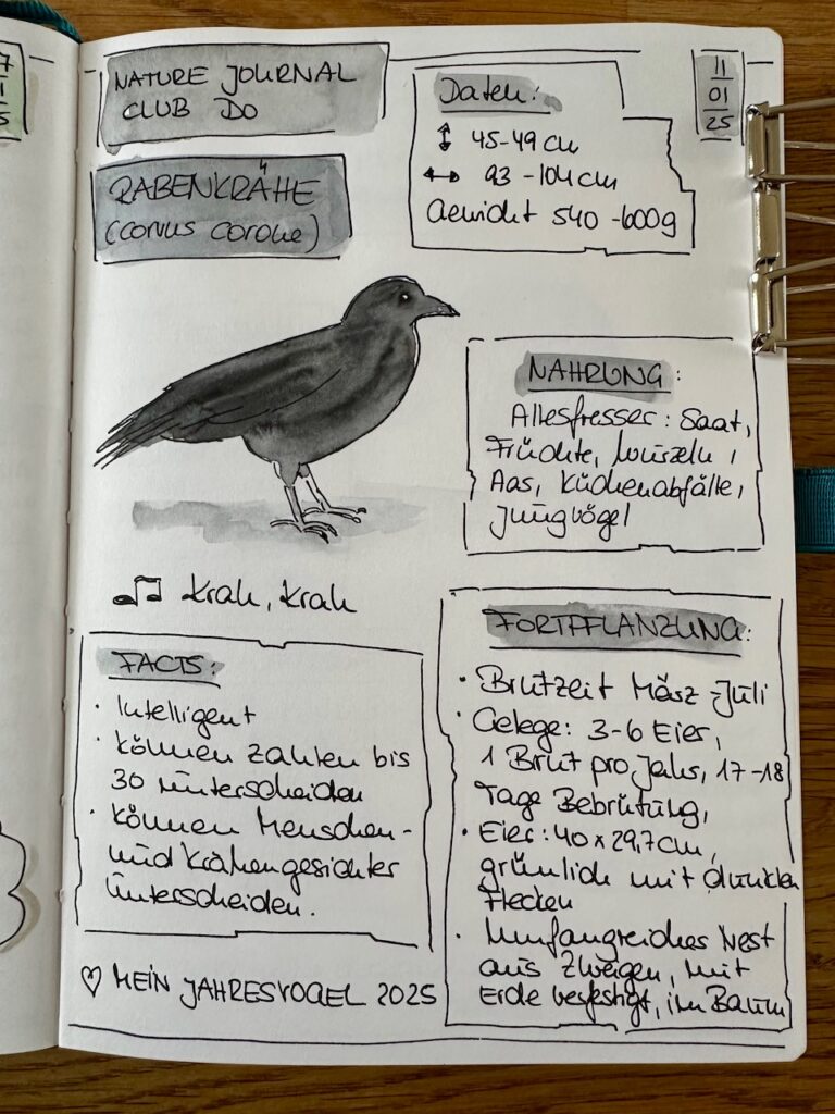 Bei Nature Journaling & Coffee beschäftigen wir uns ja diesen Monat mit den Rabenvögeln. Jede Woche wählen wir eine andere Art aus. Wir hatten schon den Eichelhäher, die Elster und diese Woche den Kolkraben. Nächste Woche kommen Nebel- und Rabenkrähe.