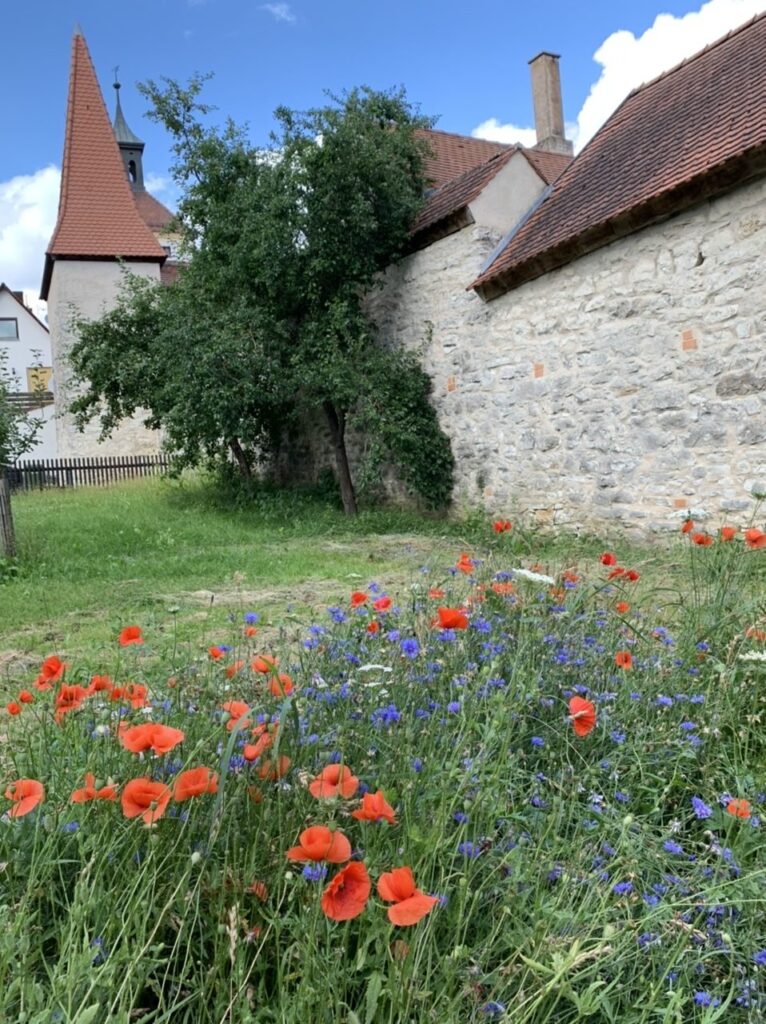 Ich war gegen 15 Uhr da, war erst mal was essen und dann hab ich eine Runde durch den kleinen Ort gedreht. Ich war noch gar nicht weit gekommen, da entdeckte ich eine Mohnwiese vor der alten Stadtmauer. Und in unmittelbarer Nähe eine Bank. Also habe ich Block und Stifte ausgepackt und habe ein bißchen gemalt.