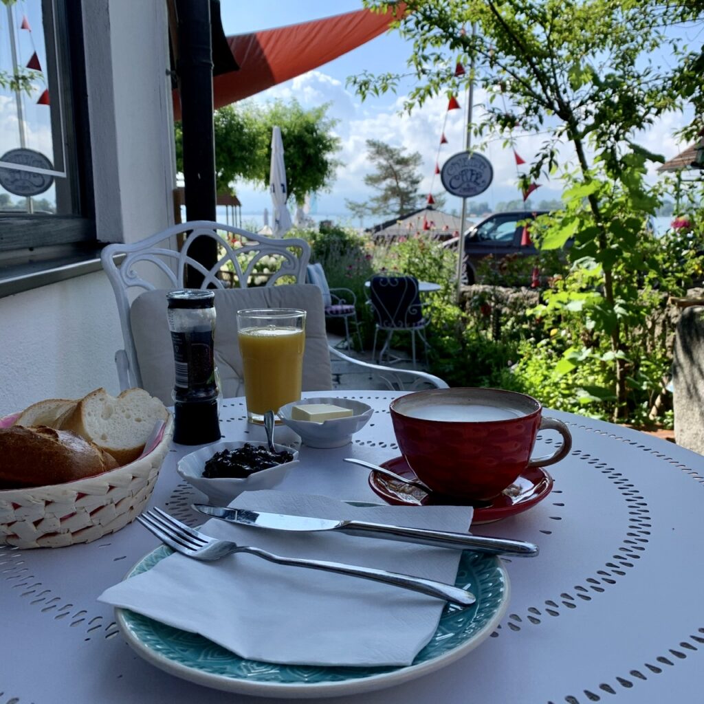 Meine nächste Station war der Chiemsee. Er lag quasi mitten auf dem Weg zum Ziel, da musste ich doch anhalten. Ich habe dort erst mal gemütlich in einem netten Café am See gefrühstückt.
