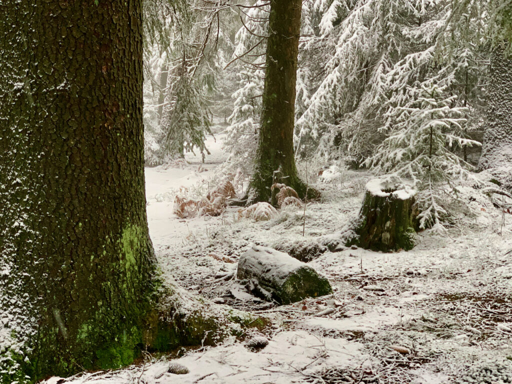 Samstag morgen hatte es über Nacht gefroren. Ich habe daher mit Lise spontan eine besonders große morgendliche Runde im Wald gedreht. Und das war ausserordentlich schön! Ich liebe es, mich dick einzupacken und dann die trockene Kälte auf der Haut zu spüren. Im Wald war es wieder ganz trübe, wie so oft im Moment.