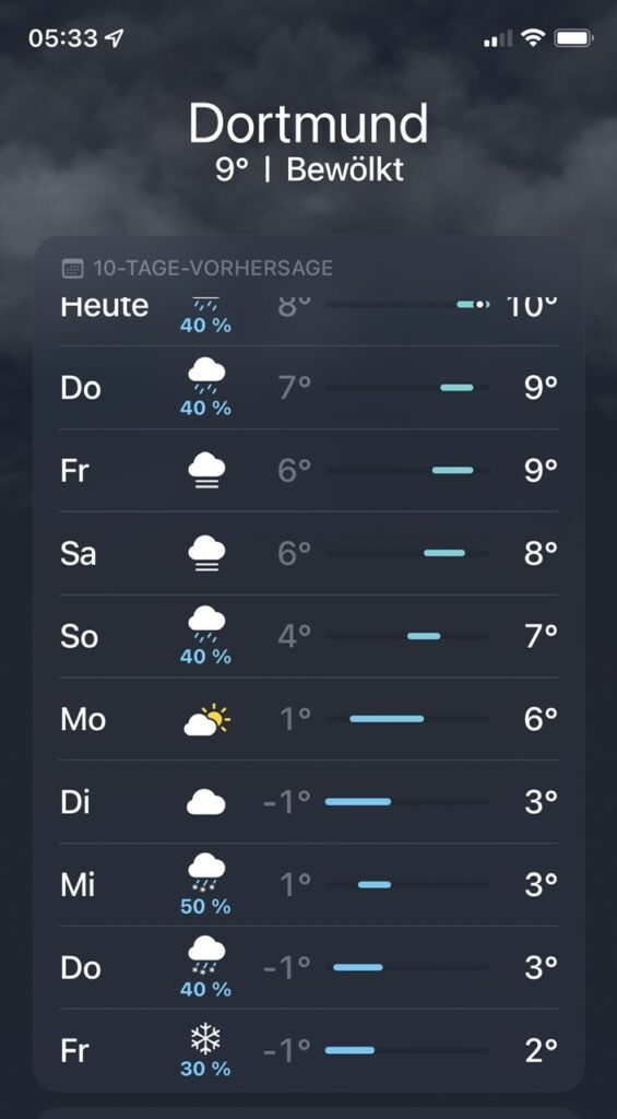 Und was mich am Mittwoch besonders gefreut hat: Die Prognose meiner Wetter-App zeigte für Heiligabend in Dortmund Schnee an. Ach, wäre das schön!