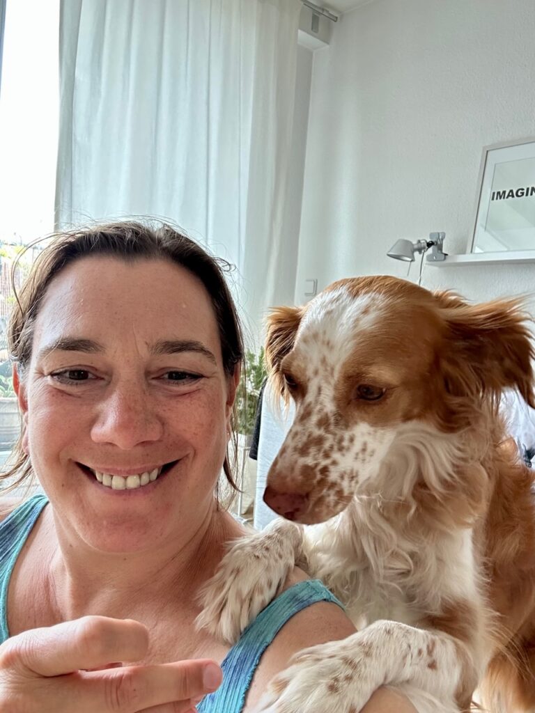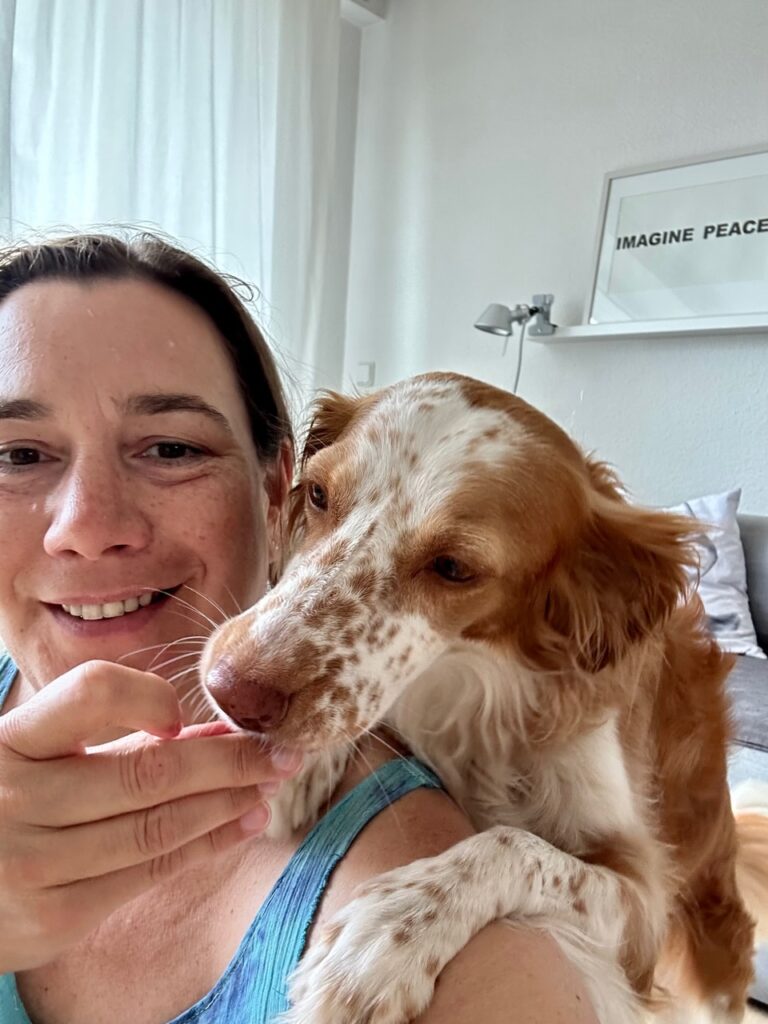Ich habe mit Lise einen neuen Trick einstudiert, den Selfie Trick. Ist vielleicht kein wirklich wichtiges Kommando, aber wir hatten Spaß. Der Trick geht so: Ich setze mich auf den Boden vor Lise, habe ein Leckerchen in den Händen und sie muss mir mit den Vorderpfoten von hinten auf die Schulter springen, dann bekommt sie das Leckerchen und ich kann ein Selfie machen. Jetzt könnte man sich vor dem Fotografieren noch irgendwie hübsch zurecht machen. Das hab ich aber vergessen. Insofern bin ich auf den Fotos nicht adrett, aber wir hatten viel Spaß. 😉